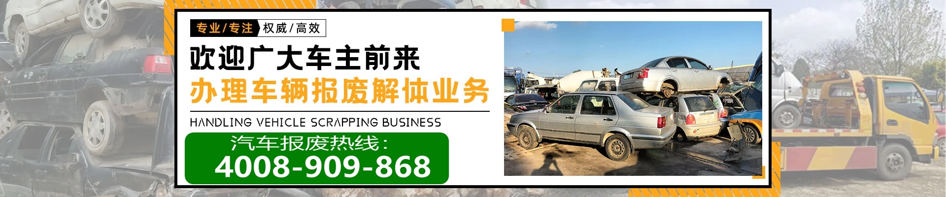 查看更多-->报废车收购、报废货车回收、小轿车回收、老旧车回收、汽车报废办理回收各类旧机动车(轿车、商务车、吉普车、面包车、货车、大巴中巴、工程用车等,久停、残旧、碰撞变形、到期报废均可,数量不限);高效全面快速一站式办理各类机动车报废注销业务,大货车、大巴车、小货车、小汽车、拖车、拖头、搅拌车、泥头车、渣土运输车、面包车、水浸车、火烧车等各类车辆都可以快速办理报废注销业务;提供上门拖车服务